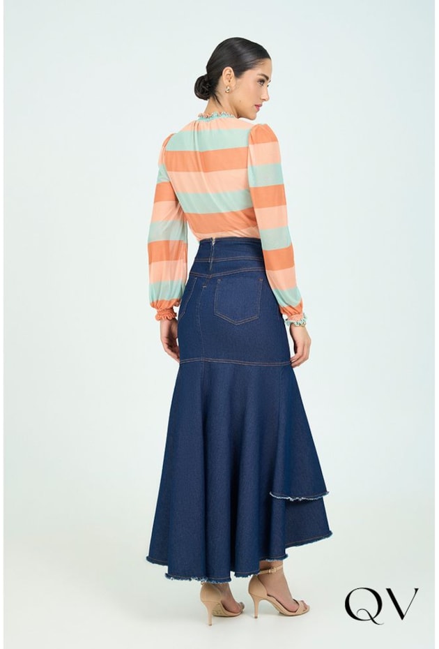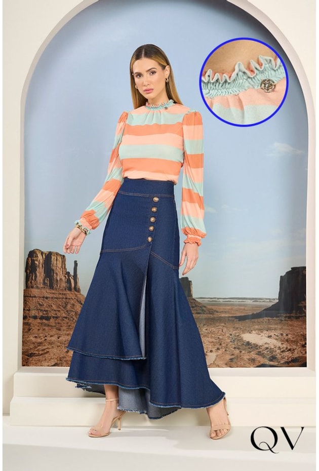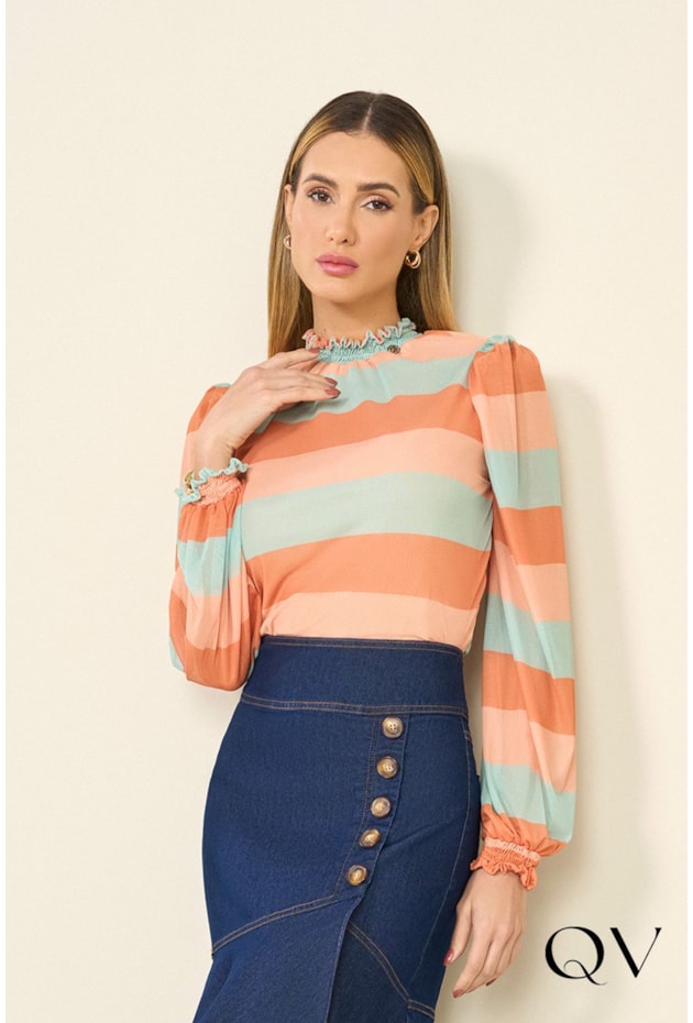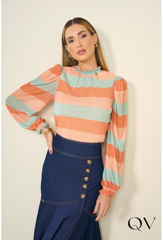 BLUSA TULE GOLA ALTA EM LASTEX LISTRADO - VIA TOLENTINO