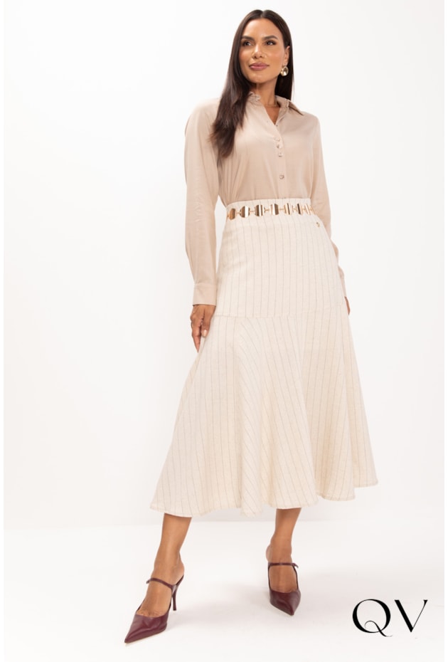SAIA MIDI EM LINHO RISCA DE GIZ CRU - LEKAZIS