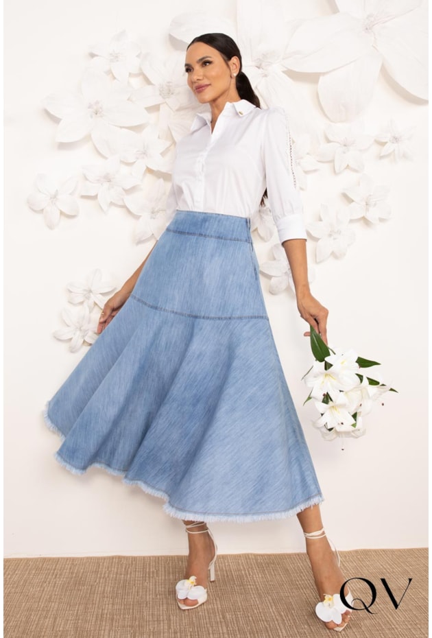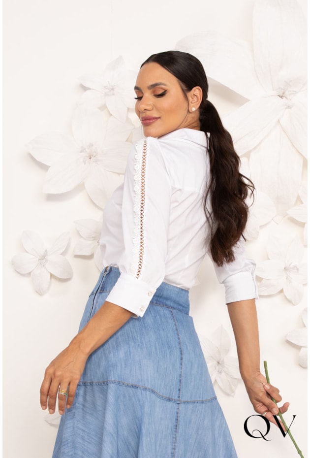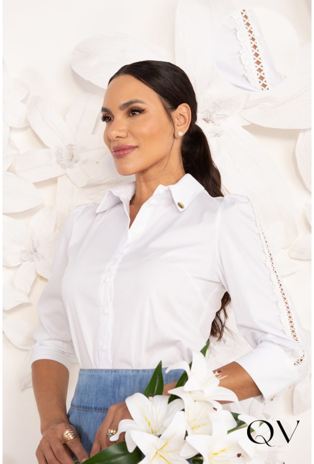 Camisa Em Tricoline Com Entremeio Branco Lekazis QVestido - Moda Executiva Feminina