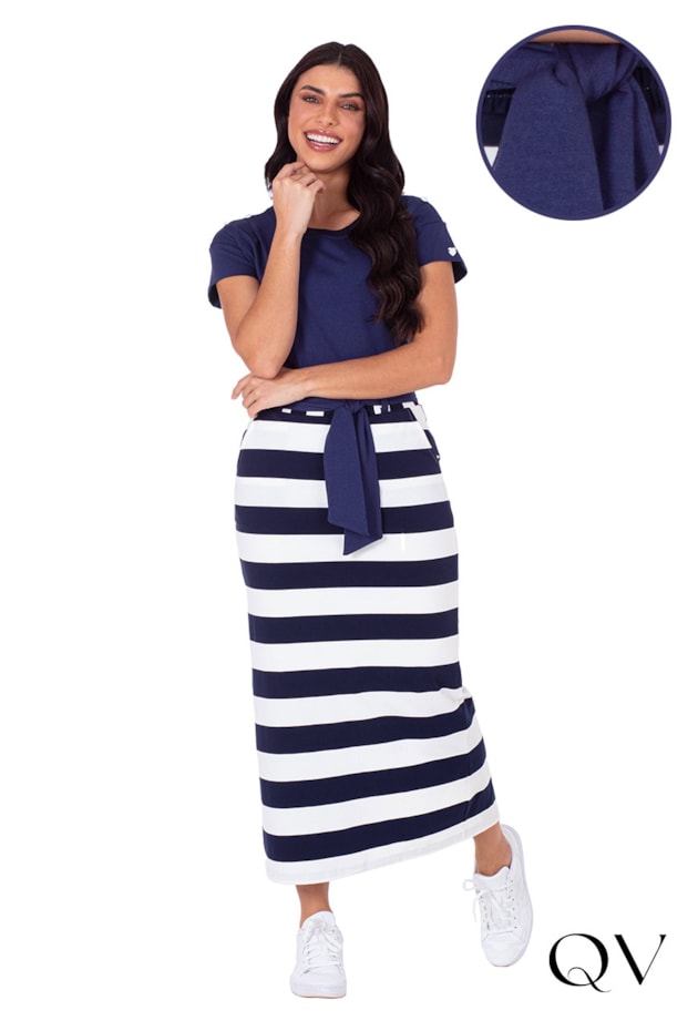 CONJUNTO MAX MIDI EM MALHA PIQUET LISA E LISTRADA PRETO - HAPUK