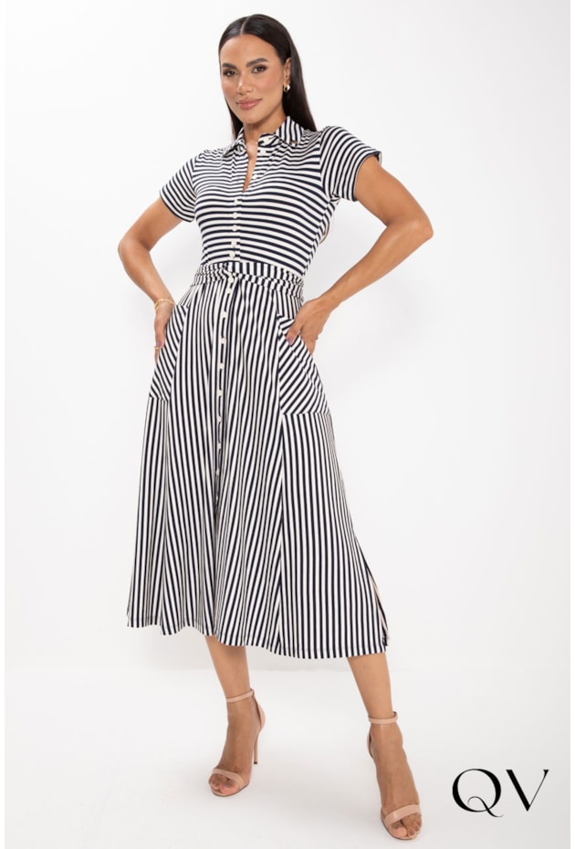 VESTIDO CHEMISE MIDI EM TRICOLINE LISTRADO AZUL - LEKAZIS