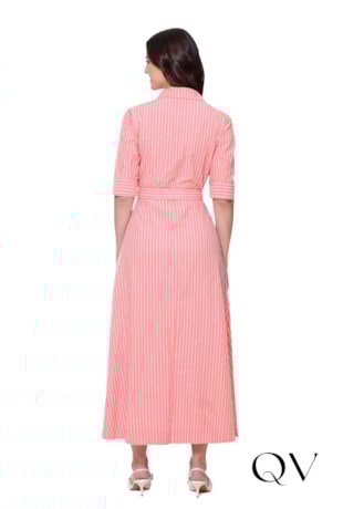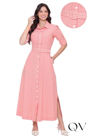 VESTIDO CHEMISE LISTRADO EM TRICOLINE ROSA E OFF WHITE - LEKAZIS